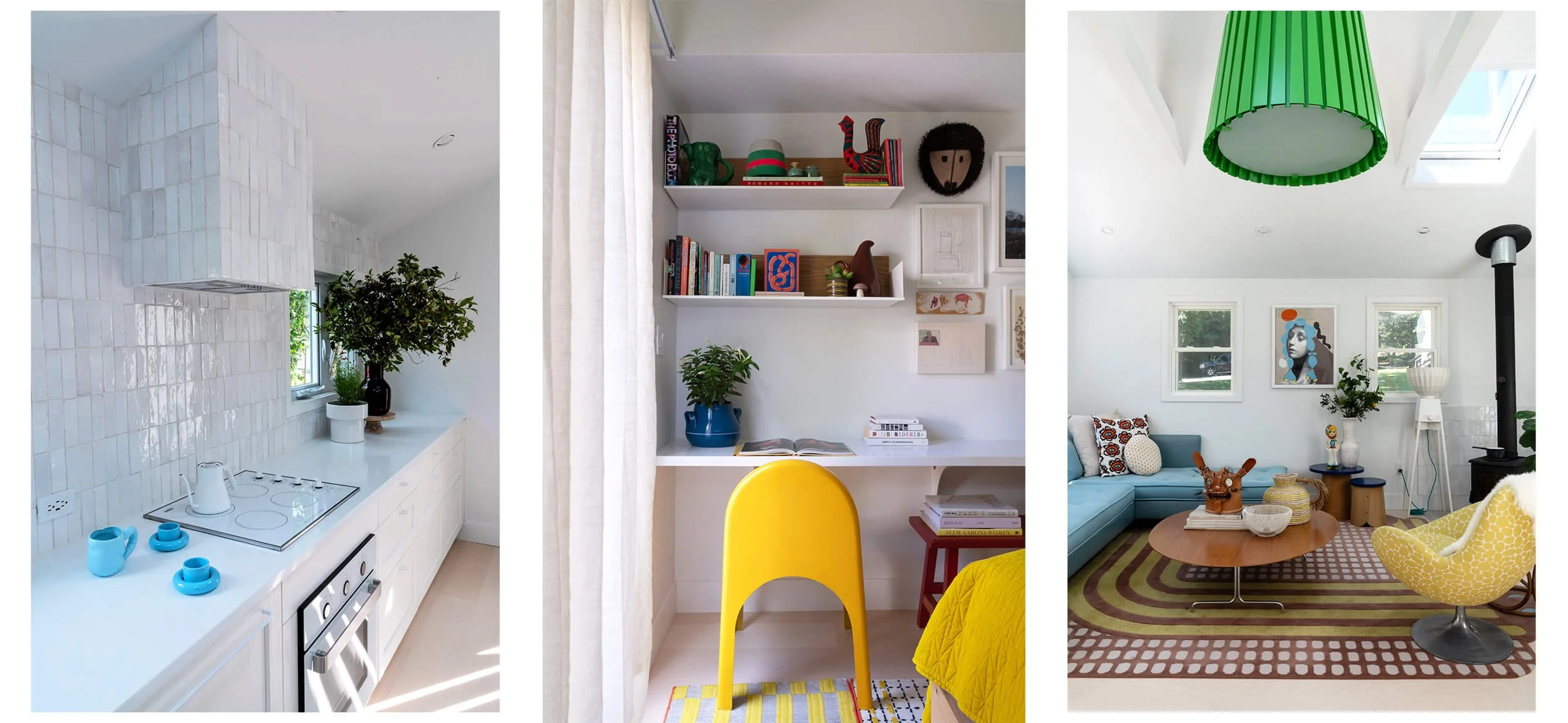 “My vision was for the tiny home to feel white, bright and welcoming” Ghislaine explains. Inspired by the shifting seasons of Upstate New York, she layered muted-yet-vibrant hues throughout the space, tones pulled straight from nature but infused with her trademark playfulness. The effect is unmistakably Ghislaine: bold yet considered, joyful yet serene.
