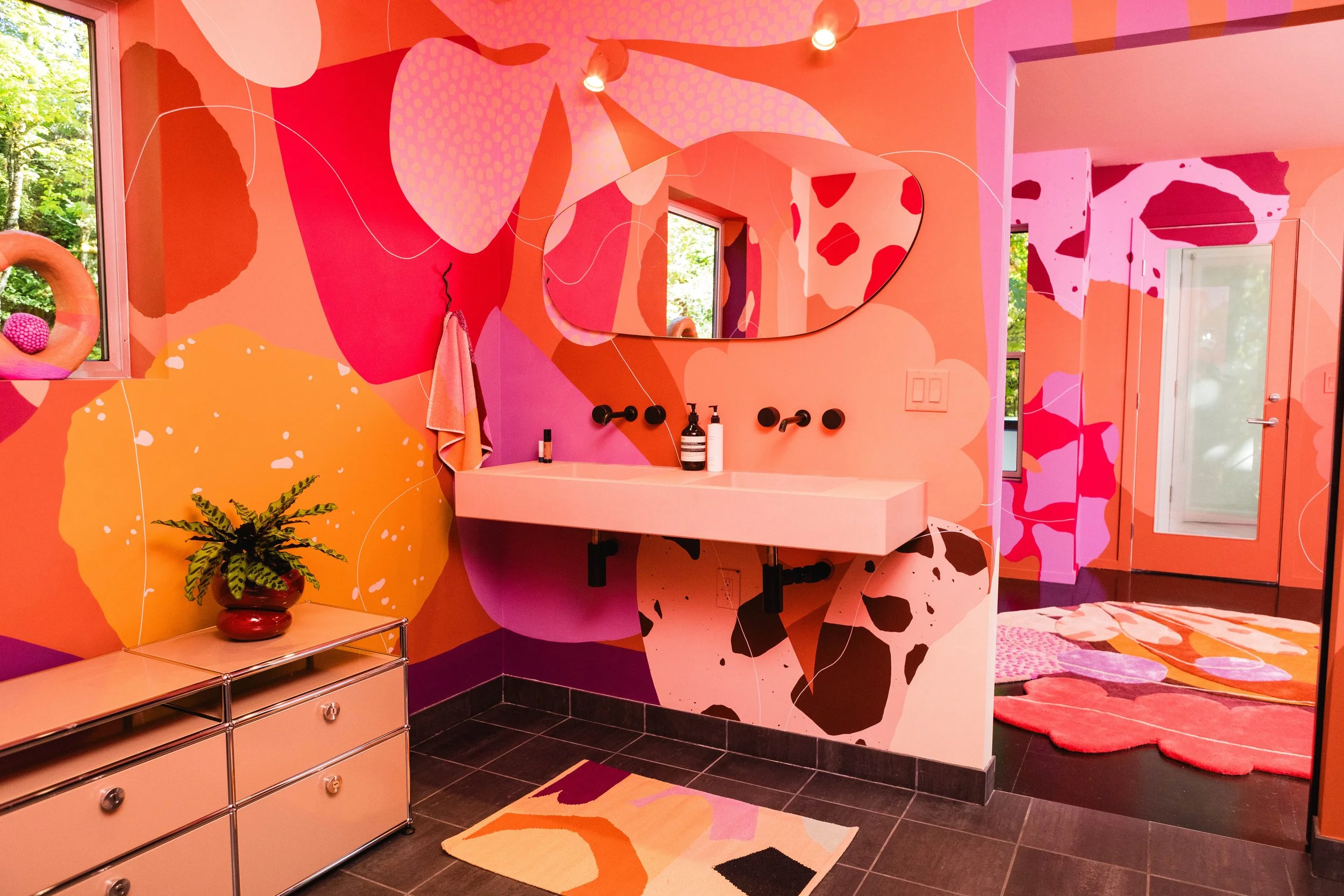 Multidisciplinary artist and designer Alex Proba filled a soaring, modern house in the woods with her signature explosive use of colour.